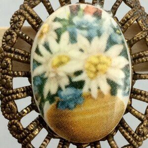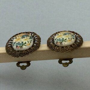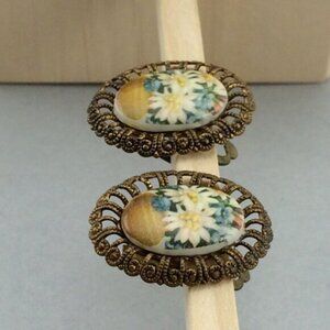 Daisy Flowers Filigree Framed Cabachon Clip On Earrings Oval Cottagecore Granny