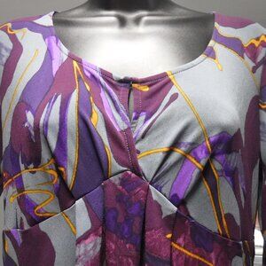 Daisy Fuentes artistic slinky top in size US M. Bold artistic floral print on a stretchy 95% Polyester and 5% Spandex material. Armpit to armpit is 16 inches with considerable stretch and length is 24 inches.