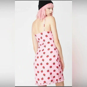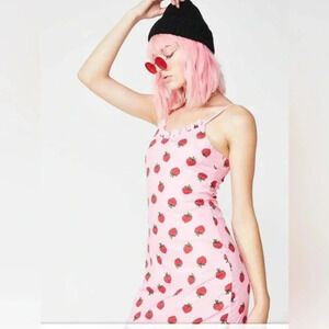 Pink with red strawberries this mini is fully lined and features adjustable straps and ruffling at the collar and hemline.