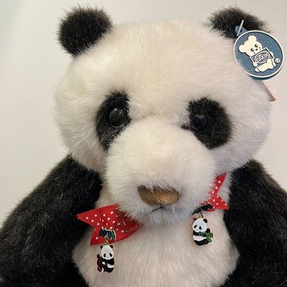 Dakin Vintage Ping Panda White Black Bear Bow Tie Stuffed Plush Toy Animal 1983. With Panda Pins on Bow- panda & 1988 Olympic pin