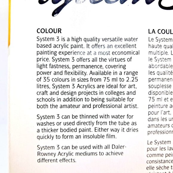 System3 acrylics are known for their "soft body" consistency, which makes them easy to apply and ideal for covering large areas smoothly. The paints are water-based, offering excellent lightfastness (resistance to fading), and are highly pigmented for vibrant, opaque color. Once dry, the paint is durable, flexible, and water-resistant, making it suitable for a variety of surfaces, including paper, canvas, and wood, for both indoor and outdoor use.