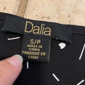 Add a touch of playful charm to your wardrobe with this stylish blouse from Dalia. This black top features a whimsical print of small white hearts and dashes, creating a fun yet sophisticated look. The cap sleeves and rounded, slightly high-low hemline offer a flattering and comfortable fit. It's a versatile piece perfect for the office, a casual day out, or a relaxed evening.