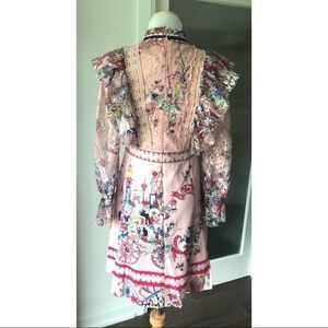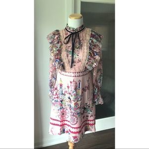 Whimsical and fun printed minidress by Canadian/American designer, Dalia MacPhee. SO cute and flirty. Printed lace, ribbon bow, frilled cuffs, detailed print on the skirt. Turn heads with this eye catching piece! One tree is planted for each dress purchased. New with tags.