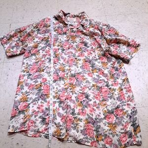 This vibrant button down shirt features a lively floral pattern in pink and orange, perfect for warm weather. Made from a light material, it offers a relaxed fit ideal for casual summer outings. 100% silk