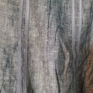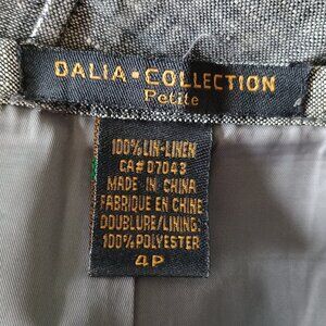 Dalia Collection petite women skirt, size 4p. Grey. Side zip and hook. Tulip hem. 100% linen, lining 100% polyester. Small vertical grey ribbon appliqués.
