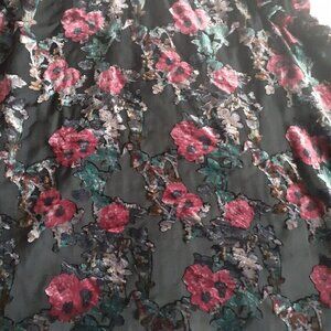 Color is black with burnt velvet floral pattern in red, green, purple and brown