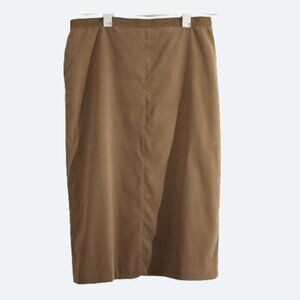The Dalia skirt is a midi-length, straight-cut skirt in a classic tan color. It features a front closure with a discreet zipper and a smooth, minimalist design without any prominent patterns or embellishments. The skirt appears to be made from a sturdy fabric, offering both style and comfort for versatile wear, suitable for both casual and professional settings. There is a small snag on the back near the bottom, which is hard to notice unless viewed up close. Otherwise in excellent used condition