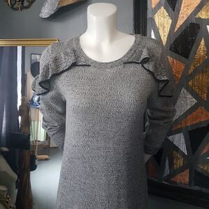 stunning ruffle shoulder knit sweater dress from Dalia. gorgeous black and white brindle pattern that looks grey from a distance. black piping along ruffles. long sleeves with rounded scoop neck. worn once. in excellent condition. slightly a line in shape. perfect elegant yet casual edition to any wardrobe! rayon/polyester blend. size small. see measurements below!