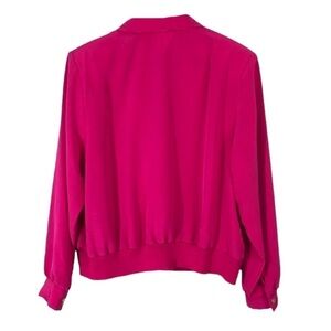 Vintage 80’s bright pink, long sleeve, gold button front, collared top, shirt, or blouse with shoulder pads from D’Allairds