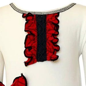 Top: Cream long-sleeve bodice featuring a tuxedo-style ruffle panel with red and black contrast fabric.