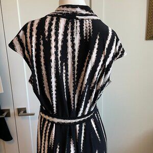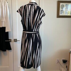 Dana Buchman Cap Sleeve Faux Wrap Abstract Print Polyester Blend Dress w Belt in Black Tan Off White