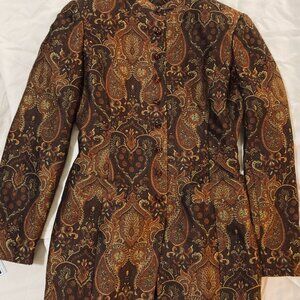 A stunning Dana Buchman tailored jacket, in excellent condition - like new! Paisley golden brown design with 9 Lucite buttons. The 2 front pockets blend seamlessly into the design. Classic Dana B... heavy enough to wear as a jacket in cool fall weather, goes with jeans, skirts, dresses. Measurements (see also pics) - waist about 15" / 38cm, length 30" / 72 cm, pit to pit about 18.5" /47 cm, sleeve length 24" / 61 cm, shoulder to shoulder seam 16" / 40.5 cm. Fabric is 60% Viscose Rayon, 28% Acetate, 12% Poly.