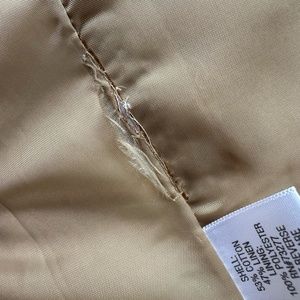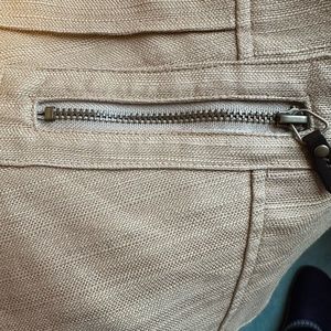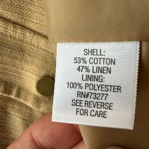 Dana Buchman camel-coloured blazer in a cotton/linen blend. Two small breast pockets with snap closure and two side pockets with zipper closure. Zip front. All zippers have leather pulls. Fits true-to-size. Lining has given way at the seam in one small spot — see photo. This would be a very easy repair.