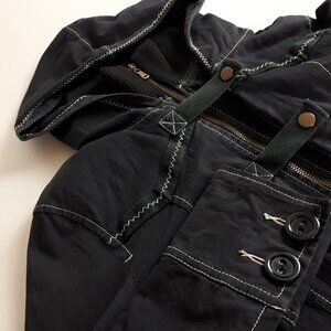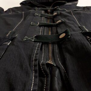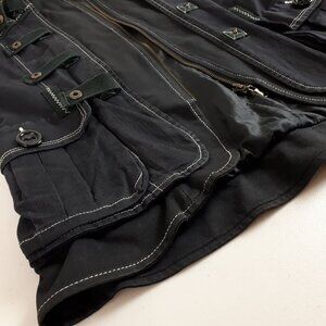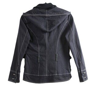 A unique jacket in a black shade with contrasting stitch detail. The fabric on the built-in vest has a slight stretch for a comfortable fit. Perfect for spring and fall. Note: there’s a tear near the brand label as shown in the last photo but it doesn’t affect style or functionality. Overall, it’s in very good condition.