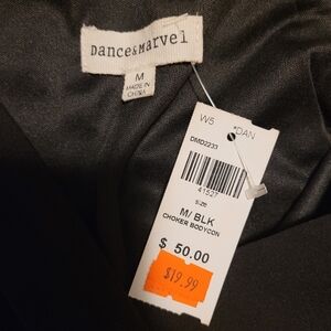 This LBD is fully black with choker collar and thigh slit detail. sits around mid-thigh. Purchased on sale but never worn.