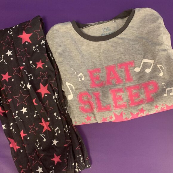 Two piece girl's PJ set with long sleeve shirt and long pants. 'Eat Sleep Dance Repeat'