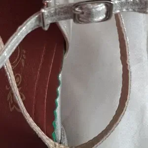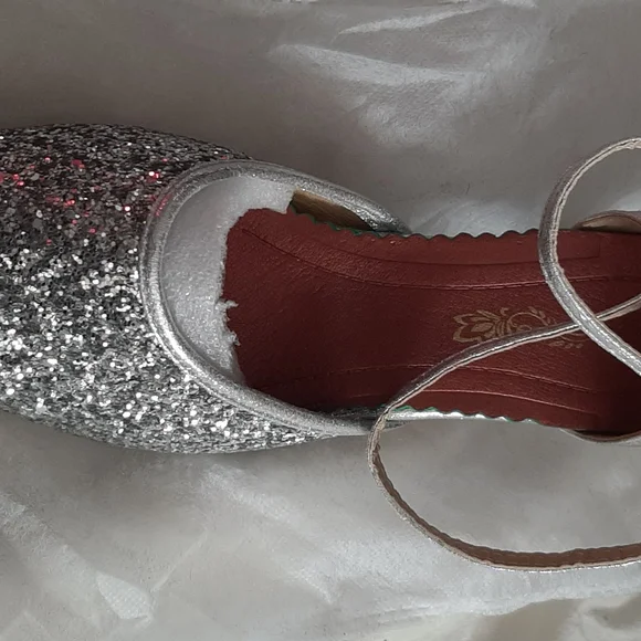 Beautiful silver sparkle dance shoes with strap across front of foot. Professional low heels Perfect condition unused.
