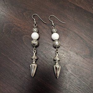 Silvertone metal with a white bead. Filigree round silvertone beads. Approx. 3 1/4" including the hooks; 2.5" without.