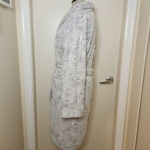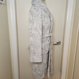Silvery blue & white floral print housecoat with deep pockets and classic tie waste, by Daniel Buchler New York.