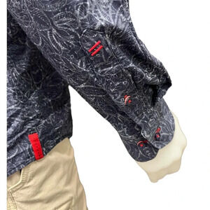 Daniel Hechter Paris men's button up dress shirt printed navy blue with red and light blue accents, double button cuff closure.