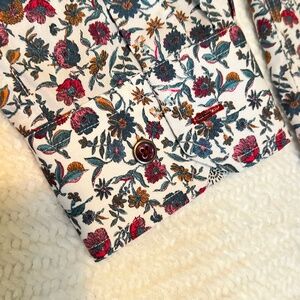 Color/Pattern: White base with multicolor floral print (red, teal, mustard accents)