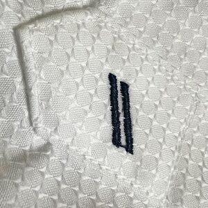 Color/Pattern: Bright white with subtle diamond-texture weave, black accent stitching at buttonholes