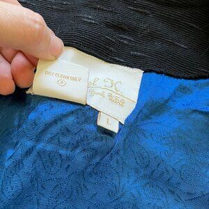 Vintage Daniel K jacket has textured black & royal blue fabric with large embroidered applique giraffe design on the front and sleeves. Beautiful glass button closures. Fully lined with royal blue rayon brocade fabric. Tag says dry clean only. 80% cotton/20% rayon, made in India. Tag size is "Large", see below for garment measurements.