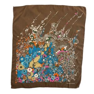 This signed Daniel La Forêt scarf showcases the label’s collectible 60s–70s graphic style: a bold abstract/psychedelic field on chocolate brown. The fabric is light and fluid with hand-rolled edges, draping beautifully—perfect for adding color and movement to any look. La Forêt pieces are sought after by scarf lovers for their punchy artwork and quality finishing.
