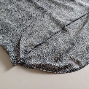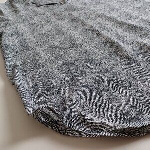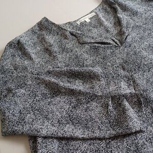 A light blouse with a fine chevron print in black and white. The material is flowy and doesn't stretch. The ¾ sleeves and pleats at the back give it a relaxed fit and breezy feel. Perfect for spring and summer. Great condition.