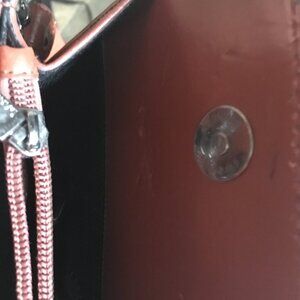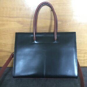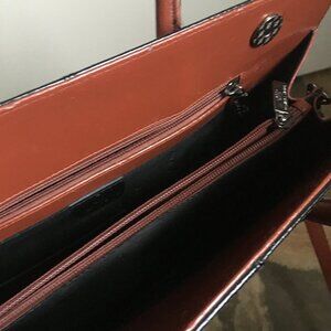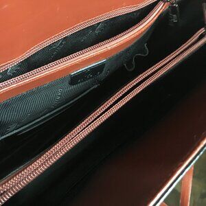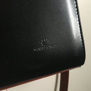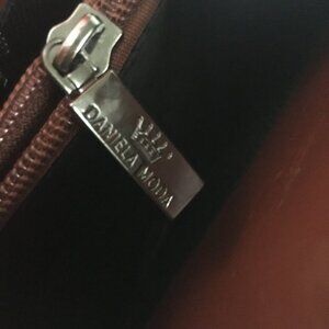 Good preowned condition, envelope style (not sure what you would call it) shoulder bag with many pockets and functional zippers by Daniela Moda. It is a combination of genuine leather and bonded leather. Sadly the bonded areas have begun to fray, and there is some overall wear (please see images for close ups). Otherwise this bag is quite cute. And twilly scarfs could be placed over them maybe.