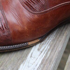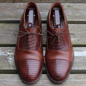 Daniele Ferradini genuine lizard and calf skin men's brown cap toe oxford, size 7.5 M. Uppers are in great condition with only noted damage being on the inner sole edges (see pics), and have been conditioned with Saphir Reptan exotic leather conditioner.