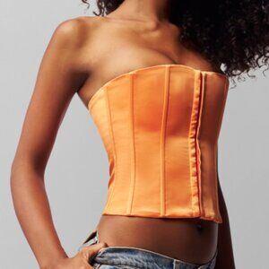 Stunning Danielle Guizio satin corset top in vibrant orange.