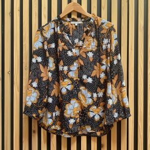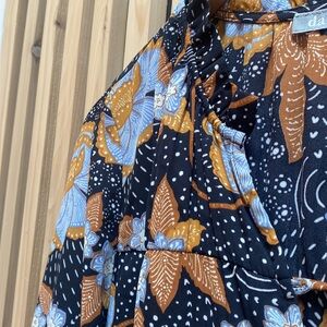 Size Medium Petite. Fits loose & flowy like a medium. Pattern is a gorgeous periwinkle blue with black and cream, topped with the most beautiful caramel colour. ❤️ stunning with jeans, white wide leg pants…