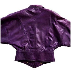 It doesn't get more 80's than this!! Bright purple leather with matching lining. Double breasted with a narrow shawl collar. V cut hem at the centre front.
