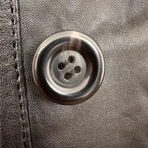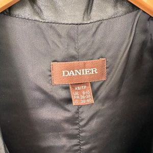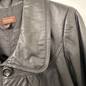 Black Danier leather button-up blazer is a short, semi-boxy fit with a cute flair. It's made in Danier’s iconic buttery soft lamb leather and is finished with two buttons and waist pockets. It works well with high-waisted jeans or over a fitted dress. Circa mid-2000s.