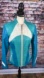 This unique retro leather jacket features a distinctive color-block design with panels of blue, turquoise, and white leather. A soft quality leather.