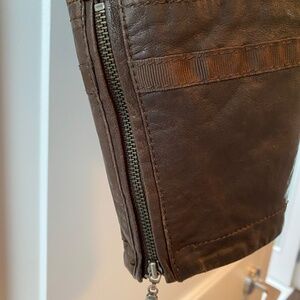 A classic moto style leather jacket in chocolate brown. Genuine leather, fully lined, traditional hardware detailing in silver. Key features include zippered pockets, zippered cuffs, and a coin pocket.