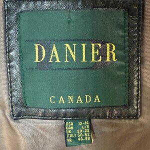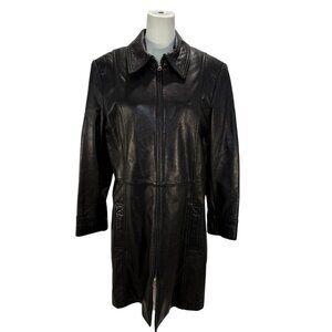 Danier, leather coat, black leather, genuine leather, trench coat, car coat, long jacket, zip-up, classic, collared, timeless, quality, fall fashion, spring fashion, outerwear, size L, large, size 12, Medium, Small