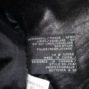 Great condition - Zip in lining is missing & some wear on edges of sleeves. A 2" rip under the right arm in the leather.