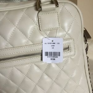 Chic cream quilted pattern. Dual handles with detachable strap. Front zipper with tassel accent.