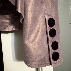 Has gorgeous velvet buttons and scarf, beautiful multi-coloured stitching inside, a metallic/shimmery finish.