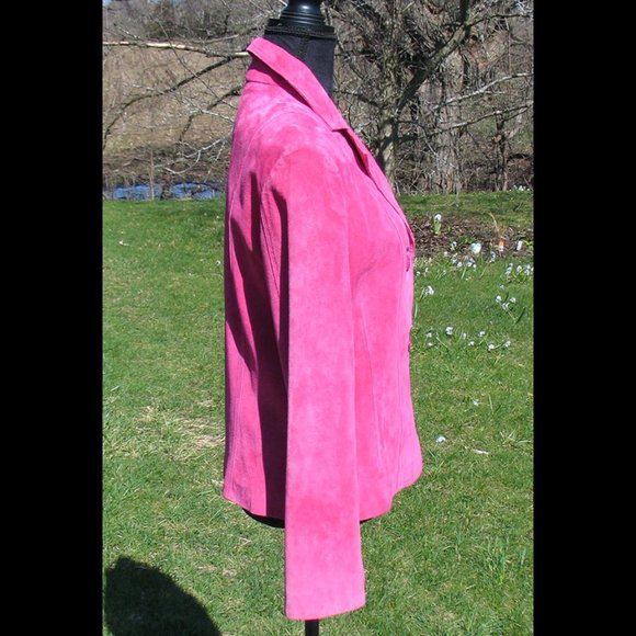 2 button front, no pockets. Vertical topstitched seams front and back. Matching pink polyester lining. Soft suede, never processed