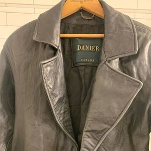 Mid-length genuine leather coat, flattering cut, belt and pockets.