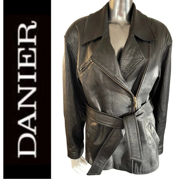 Danier Leather Coat Motorcycle Jacket Black Leather Belted Coat Small
