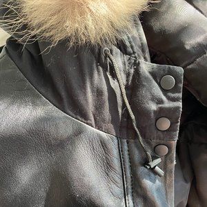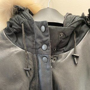 Gorgeous Danier Leather down-filled coat with fur hood and real leather trim. Sleeves have additional liner for warmth.
