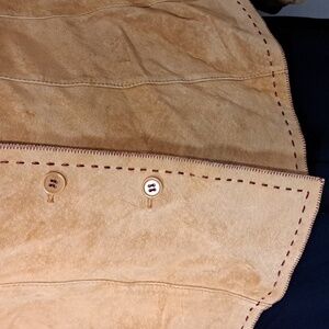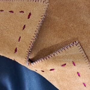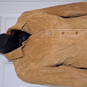 Light Suede jacket embellished with red stitching. Shows light wear but overall very good condition. Please see the photos for measurements to determine fit. Questions are always welcome.