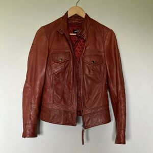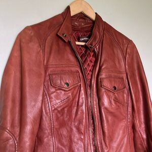 This Danier leather jacket features a rich brown hue and a classic moto design, offering a fitted silhouette with a sleek, polished finish. Its timeless style makes it a versatile addition to any wardrobe, perfect for elevating your look with a touch of sophistication.