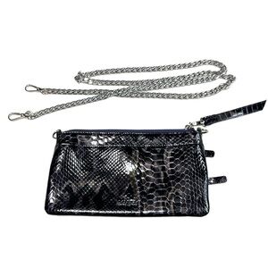 New without tag. Snakeskin embossed patent bag. Multiple zip closure. Removable chain strap. Silvertone hardwares.