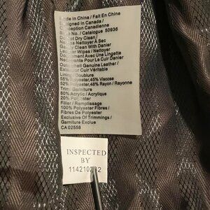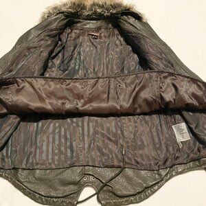 This jacket is pre-owned and in used condition. There are a few small marks on the jacket and the sleeves. One of the drawstrings on the back is missing the cap for it. Please see all photos for exact item.