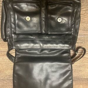 Danier EUC Mint used barely a day/ I got a similar one for my birthday Black Leather Messenger Bag, crafted with a sleek and polished finish. This classic accessory is perfect for business settings, offering a sophisticated look with its clean lines and minimalistic design. The bag's durable leather construction ensures longevity and style for any professional occasion.